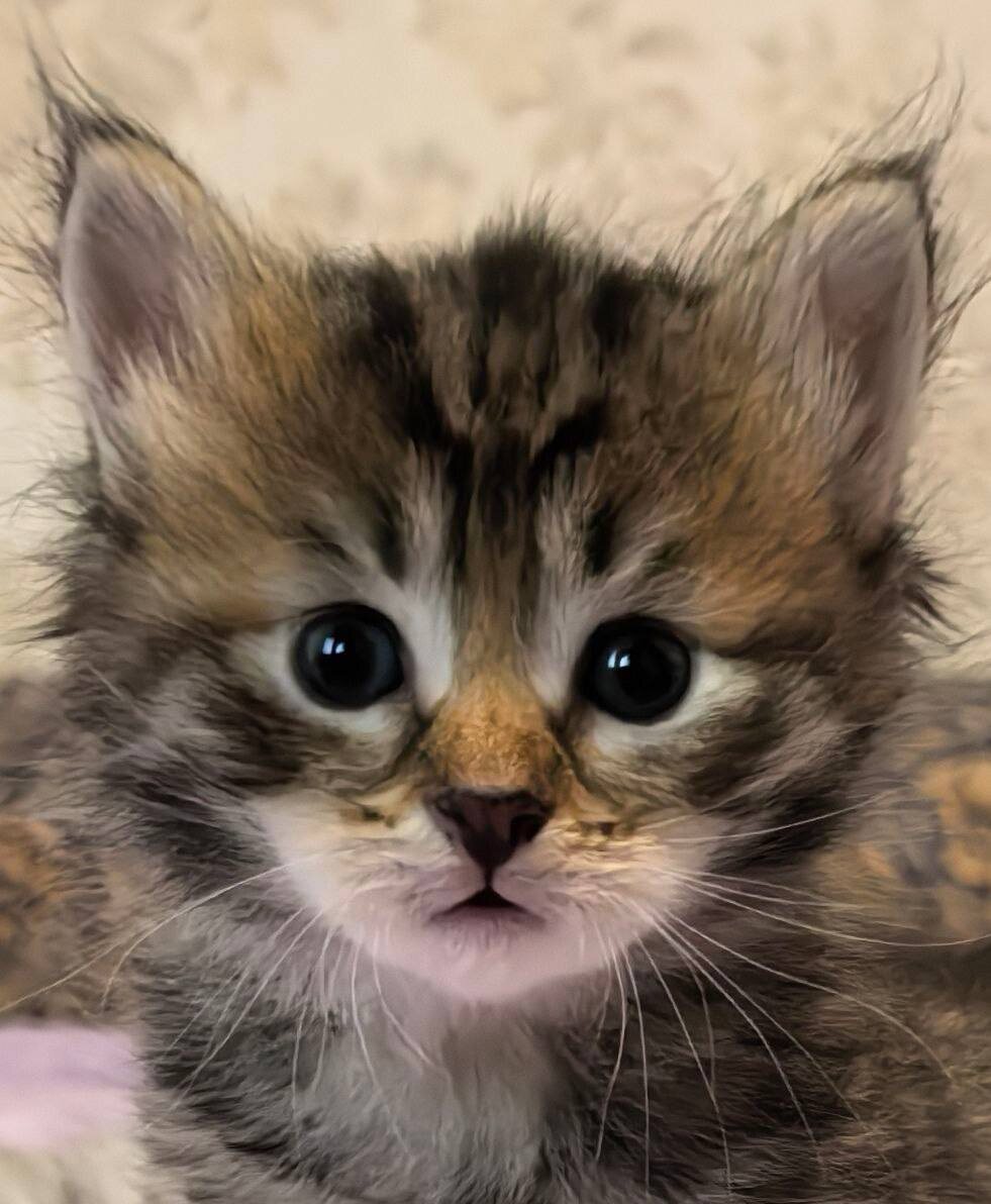 Кассиопея, окрас чёрный черепаховый пятнистый табби. Дата рождения 2 февраля 2026. Свободна.