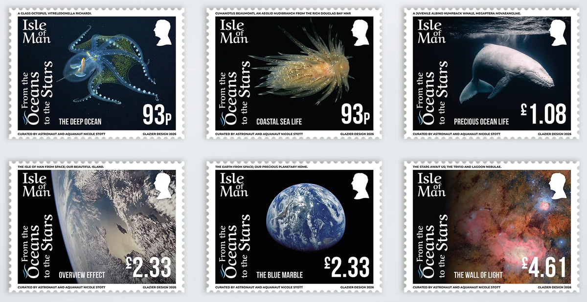 09 марта 2026 года почта Острова Мэн выпустила филателистическую продукцию посвящённую нашей планете и безграничным возможностям человеческих исследований. Коллекция состоит из шести марок, составленная астронавтом и акванавтом Николь Стотт, запечатлела океаны Земли, прибрежную жизнь и захватывающие перспективы, открывающиеся из космоса.
