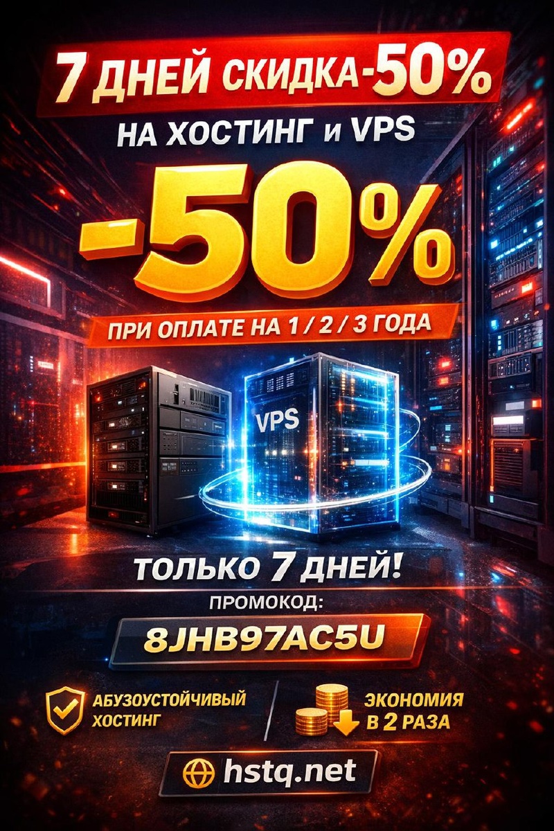 Только 7 дней. Промокод 8JHB97AC5U Акция на 7 дней: скидка -50% на все тарифы хостинга и виртуальные серверы (VPS) HSTQ при оплате на 1 / 2 / 3 года. Промокод: 8JHB97AC5U Условия: Применяется ко всем заказам хостинга и VPS Срабатывает только при оплате на 1 / 2 / 3 года Подходит, если нужен обычный хостинг или абузоустойчивый VPS Если вы решаете, какой хостинг выбрать, и проект не на неделю, то аренда хостинга / VPS на год с -50% дает максимальную экономию. Как применить: оформить заказ - выбрать срок от 1 года - ввести промокод 8JHB97AC5U Готовы стать нашим клиентом? Пишите @hstq_hosting или в чат на сайте – подберём конфиг, настроим бесплатно любой сервер Linux или Windows и останемся рядом 24/7/365. HSTQ: хостинг от $0.99, VDS от $1, cерверы от $29.99! Переходи к нам, у нас бесплатный админ 24/7/365! Аренда IPv4 Аренда серверов НАШ САЙТ | ЛИЧНЫЙ КАБИНЕТ
