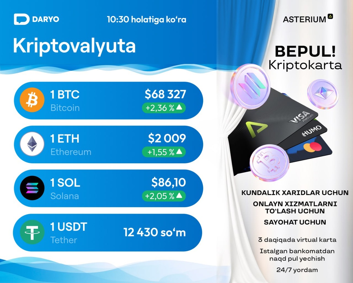 : BTC ≈ $68327 (+2,36 %) ETH ≈ $2009 (+1,55 %) SOL ≈ $86,10 (+2,05 %) USDT ≈ 12 430 soʻm Asterium — kriptoaktivlar kursi homiysi: kriptomagazin, kriptohamyonlar, kriptokartalar. O‘zbekiston bo‘ylab xavfsiz va qonuniy. Xizmatlar litsenziyalangan Ehtiyot boʻling: Kriptoaktivlar yuqori volatillikka ega va moliyaviy risklarni o‘z ichiga olishi mumkin! — Kriptoaktivlar O‘zbekiston Respublikasida to‘lov va to‘lovni qabul qilish vositasi emas. — Davlat tomonidan ta’minlanmagan. — Kriptoaktivlar bilan operatsiyalarni amalga oshirishda tavakkalchiliklar mavjud, ya’ni pul mablag‘lari, kriptoaktivlar evaziga almashtirilgan boshqa fuqarolik huquqi obyektlari kriptoaktivlarning narxlari o‘zgaruvchan. — Texnik nosozlik (xato)lar, qonunga xilof harakatlar, shuningdek, talon-toroj qilish holatlari oqibatida butunlay yo‘qotilishi mumkin. @daryolive