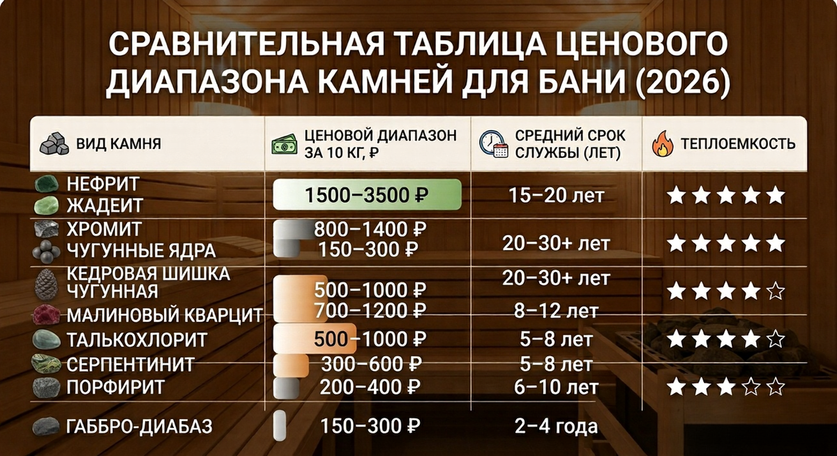 💡 Совет эксперта: Лучший результат часто дает комбинация камней. Классика — жадеит или нефрит сверху, чугунные ядра или талькохлорит снизу. Нижние камни аккумулируют жар, верхние улучшают качество пара.