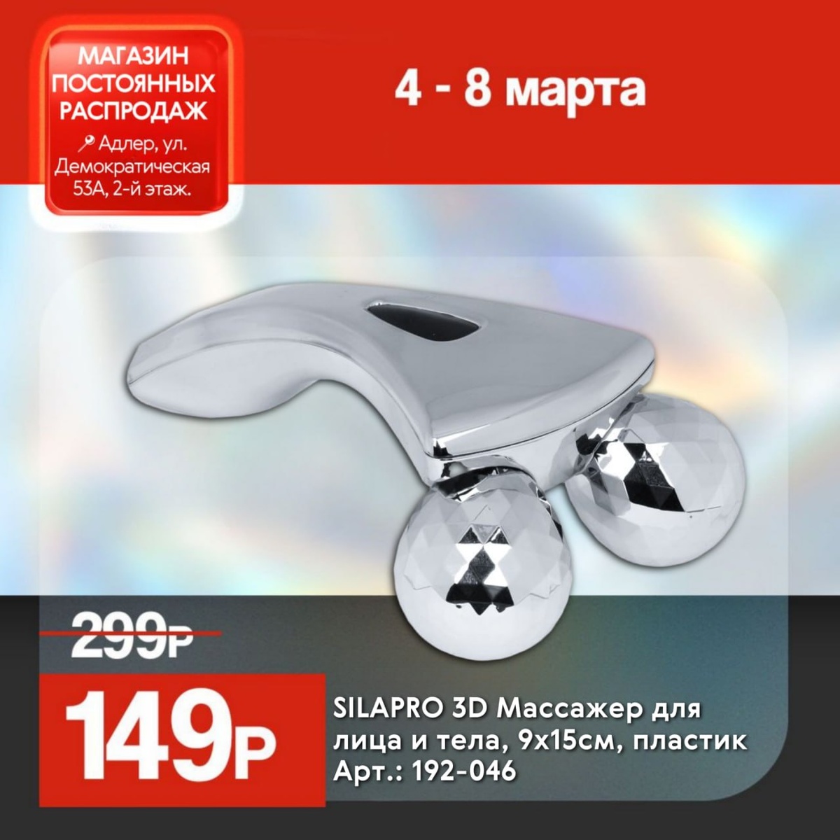 ₽! Весна — время обновления, и мы приготовили для вас настоящий подарок к 8 Марта! 🌷 Мечтаете о четком овале лица и сияющей коже без морщин? 3D-массажер SILAPRO — это ваш личный косметолог, который всегда под рукой. Почему он станет вашим любимчиком? * Лифтинг-эффект: Массажные шарики бережно захватывают кожу, имитируя руки мастера. * Микроциркуляция: Улучшает кровоток, возвращая лицу здоровый румянец и свежесть. * Универсальность: Подходит не только для лица, но и для тела — проработайте зону декольте или шеи для идеального результата. 🔥 ШОК-ЦЕНА: 149₽ 🔥 Акция действует только с 4 по 8 марта! Порадуйте себя или соберите идеальный бьюти-бокс для подруг по самой выгодной цене в городе! Забирайте свой секрет красоты здесь: 📍 г. Сочи, Адлерский район, ул. Демократическая, 53А (2-й этаж). ⏰ Ждем вас ежедневно с 09:00 до 21:00.
