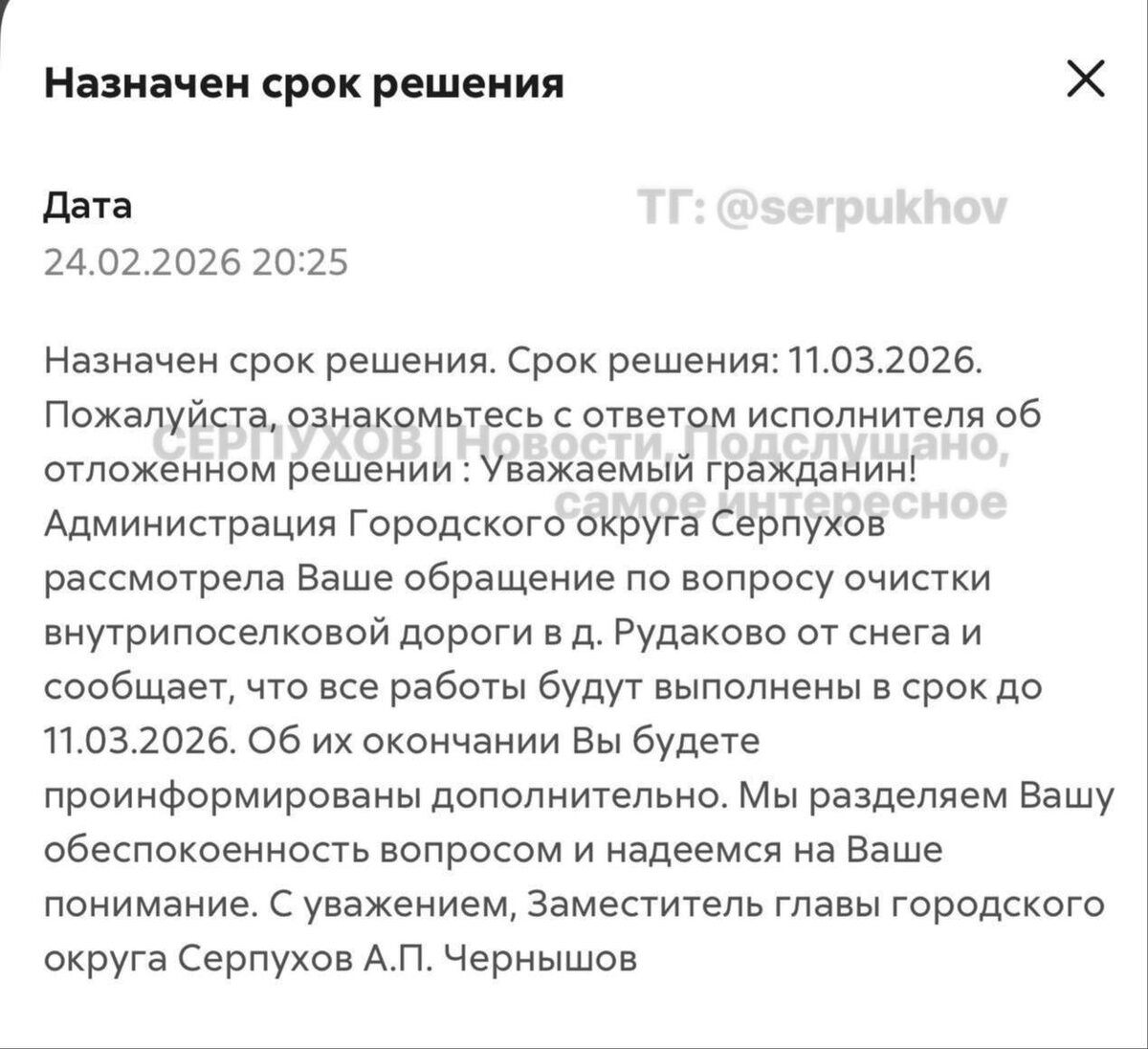 ‼️❗❕ Ранее в серпуховских пабликах сообщалось, что из-за плохой уборки снега автобус № 41 перестал доезжать до конечной остановки в Зиброво. Водитель высаживал пассажиров в Игумново, и людям приходилось добираться домой несколько километров пешком по неосвещённой лесной трассе. ➡️ Как выяснилось, это не единичный случай. Автобус № 50 («Серпухов — Рудаково») также не довозит пассажиров до конечного пункта — он не заезжает с трассы А-108 в сторону КП «Берендеево царство» и деревень Рудаково, Скрёбухово, Сидоренки. Дорога там расчищена так, что автобус по габаритам может просто не проехать, а двум встречным машинам разъехаться практически невозможно. В результате жители вынуждены преодолевать около 2,5 км пешком. 🔔 Люди обращаются с жалобами, но ответы из администрации Серпухова их не устраивают. Например, замглавы округа Андрей Чернышов назвал сроком решения проблемы с дорогой в Рудаково... 11 марта. 📌 Примечательно, что в конце января на оперативном совещании глава муниципалитета