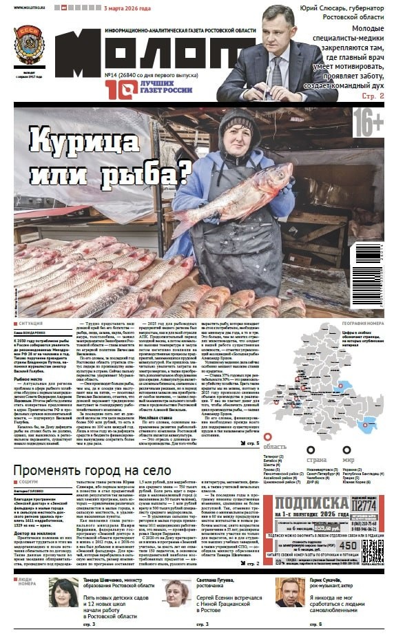 »: 📌Курица или рыба? К 2030 году потребление рыбы в России собираются увеличить до рекомендованных Минздравом России 28 кг на человека в год. Таково поручение президента страны Владимира Путина. Однако за последний год донской регион утратил статус лидера по производству аквакультуры в стране. Сейчас пальму первенства удерживает Мурманская область. В ситуации разбиралась Елена Бондаренко. 📌Кованый узор в память о поэте и сыне Ростовчанка Светлана Гугуева на свои средства украсила подъезд исторического здания на улице Серафимовича, 39, оборудовав его козырьком с кованой решеткой. В этом доме 100 лет назад Сергей Есенин встречался с поэтессой Ниной Грацианской. Подробности читайте у Александра Оленева. 📌Гарик Сукачёв: «Я никуда не пробивался» Какова природа творчества? Составит ли в обозримом будущем искусственный интеллект конкуренцию музыканту, поэту, художнику? Существенно ли то, какими человеческими качествами обладает высококлассный специалист? Эти и другие вопросы, подготовле