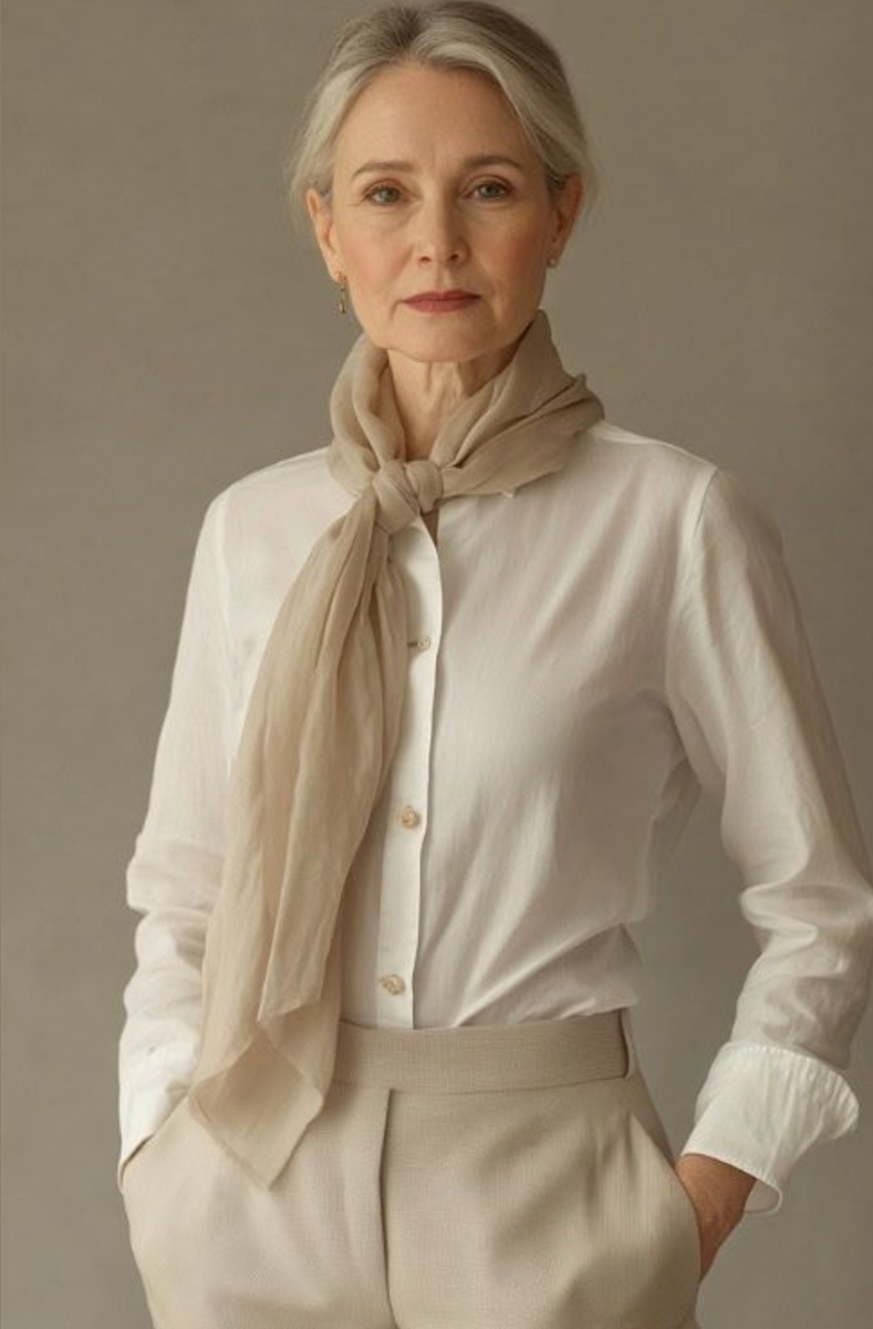 Этот образ транслирует внутреннюю свободу, которая приходит годами. И помните, что истинный стиль кроется в деталях, таких как шелковый платок на ручке сумки.