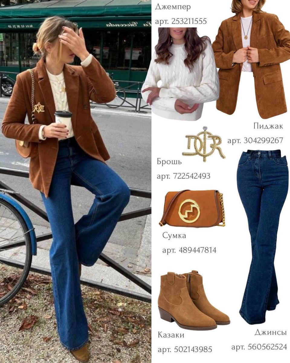 Тёплый карамельный жакет из замши в сочетании с белым вязаным джемпером создаёт мягкий, светлый акцент в верхней части образа. Расклешённые джинсы добавляют силуэту динамику и визуально вытягивают фигуру, делая ноги длиннее.