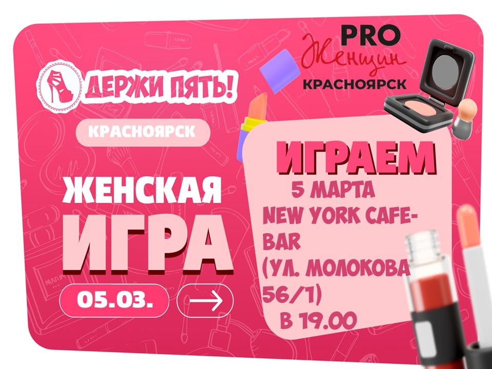 !" "Держи пять" - игра, похожая на передачу "100 к 1-му". Все вопросы предварительно были заданы паре сотен обычных прохожих, вам нужно угадать самый популярный ответ Количество вопросов в игре: 40 (6 туров по 5 -10 вопросов) Количество человек в команде от 2 до 10 Средняя продолжительность игры 2 часа 20 минут. Записываться можно в личные сообщения @Yulya_Zozulya обязательно укажите, что вы из сообщества PRO Женщин. До встречи на игре! ЖЕНСКАЯ ИГРА ⏳5 марта 19:00 📍 NEW YORK CAFE-BAR (ул. Молокова56/1) ☎ 89620759408 💥Сообщество PRO Женщин свободно от политики, религии и продаж, а все мероприятия сообщества безоплатны. #Мероприятия_pro_women_krsk Вернуться к списку мероприятий