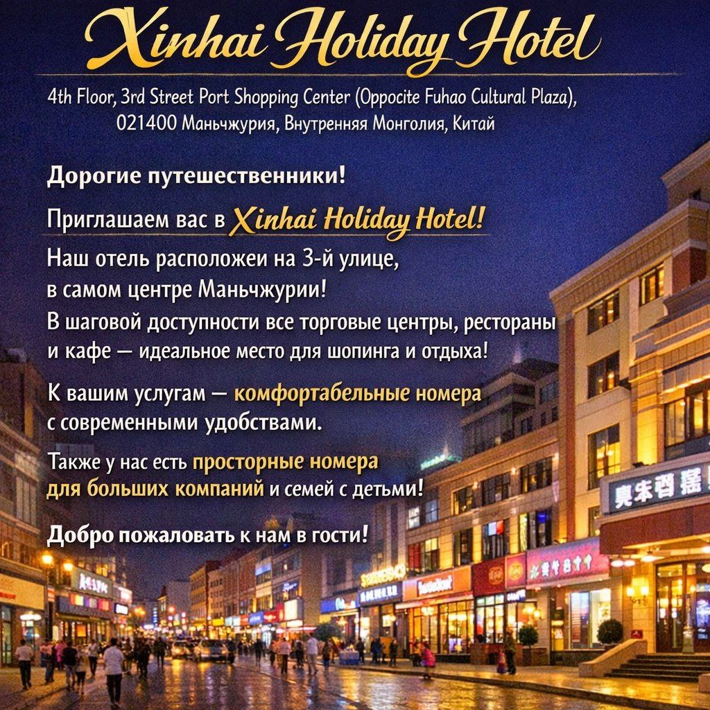 Отель расположен по адресу: 4th Floor, 3rd Street Port Shopping Center, напротив Fuhao Cultural Plaza, в городе Маньчжурия. Это удобная и оживлённая часть города — знаменитая 3-я улица, где сосредоточена вся инфраструктура для комфортного отдыха. 📍 Преимущества расположения: * шаговая доступность до торговых центров * рядом множество ресторанов китайской, монгольской и европейской кухни * удобный выход к основным туристическим улицам * всё необходимое — буквально под рукой Гости особенно ценят возможность вечером прогуляться по оживлённой улице, заняться шопингом или выбрать уютный ресторан всего в нескольких минутах от отеля. 🏨 Номера и комфорт: Отель предлагает комфортные, просторные и аккуратные номера с современным оснащением. Интерьеры выполнены в приятных спокойных тонах, что создаёт атмосферу уюта после насыщенного дня. В наличии: * стандартные номера для 1–2 гостей * просторные варианты для больших компаний * удобные семейные номера для отдыха с детьми Это отличный выб