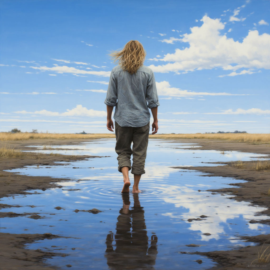 По синим лужам.