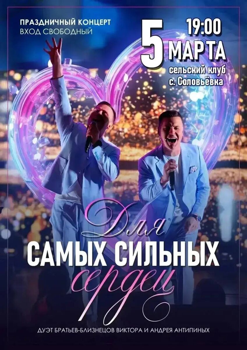 🌷Для вас выступит яркий вокальный дуэт - братья-близнецы Виктор и Андрей Антипины. Эти ребята покорили не только российскую, но и мировую сцену: 🌼 Лауреаты фестиваля близнецов в Китае (Моцзян); 🌼 Участники шоу «Ну-ка, все вместе!», «Поём на кухне всей страной» и программы Андрея Малахова на Первом канале; 🌼 Украшали своим творчеством концерт в Государственном Кремлевском дворце. 🕐Ждем всех 5 марта в 19:00 в селе Соловьевка (Сельский клуб). Вход свободный! 🌼Проведите вечер в кругу родных и подарите себе настоящий праздник музыки!