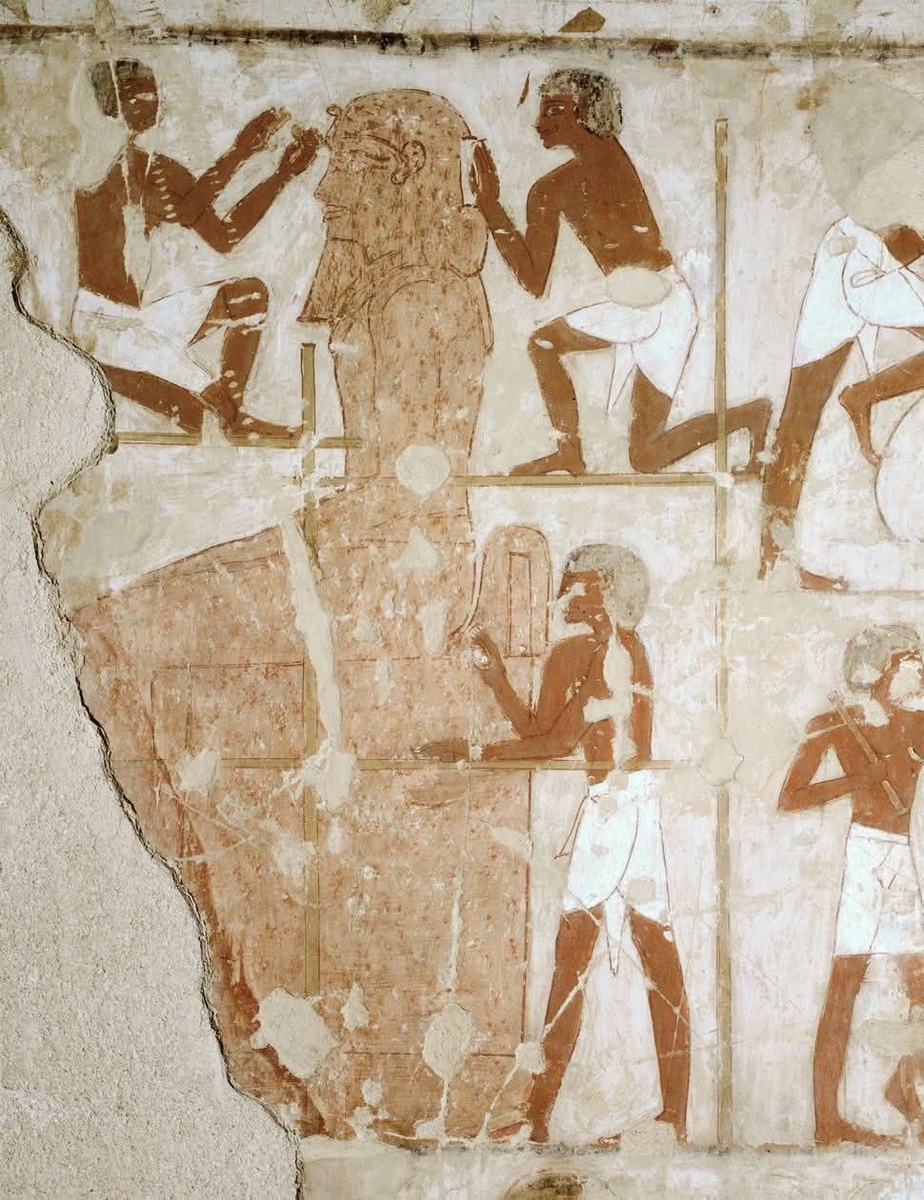 Новое царство, XVIII династия, около 1450 г. до н.э. Фрагмент росписи из гробницы визиря Рехмира (ТТ100) в Фивах — наглядная сцена работы древнеегипетских мастеров. Художник запечатлел момент, когда скульпторы, стоя на деревянных лесах, аккуратно вырезают огромную статую царя прямо из каменного блока. Эта сцена — редкое свидетельство технологии создания монументальных скульптур эпохи Новое царство Египта. Видны инструменты, этапы обработки камня и организация труда — мастера работали слаженно, поднимаясь все выше по мере формирования фигуры. Гробница принадлежала визирю Рехмир — одному из высокопоставленных чиновников при фараонах XVIII династии. Его усыпальница расположена в некрополе Фивы и известна детальными сценами ремесел и придворной жизни. Такие изображения позволяют буквально увидеть, как создавались колоссы, которые и сегодня поражают масштабом и мастерством исполнения.