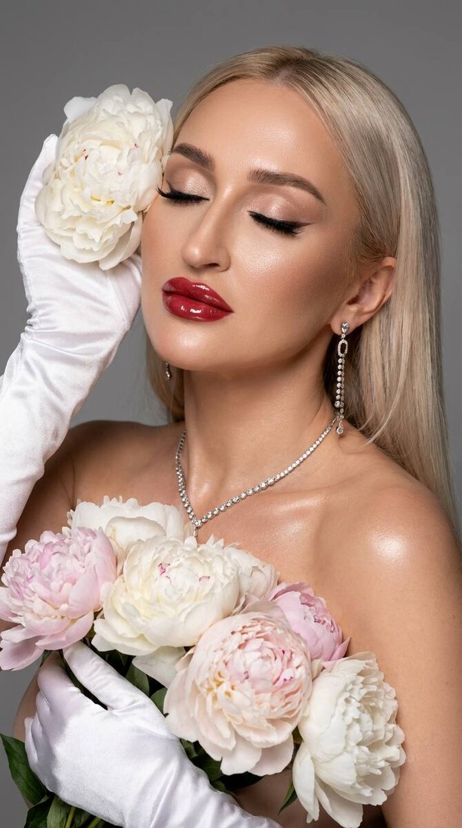 Промты можно загружать в любой агрегатор черты лица максимально схожи с оригиналом на фото. Фотореалистичный студийный портрет девушки крупным планом. Светлая кожа с естественным сиянием, ровный тон лица, мягкие световые акценты на скулах и плечах. Длинные прямые волосы платинового оттенка, гладкая укладка. Макияж выразительный: аккуратные стрелки, густые длинные ресницы, светлые тени с лёгким мерцанием, чётко подчёркнутые скулы, насыщенные красные губы с глянцевым эффектом. Поза изящная: глаза закрыты, голова слегка отклонена назад, спокойное и чувственное выражение лица. У виска крупный белый пион. В руках букет пионов белого и нежно-розового оттенков. Образ торжественный и элегантный: длинные белые атласные перчатки, колье и длинные серьги с прозрачными камнями, открытые плечи. Фон нейтральный серый. Мягкое студийное освещение, высокая детализация, чёткая фокусировка, естественная глубина резкости, художественная цветокоррекция.