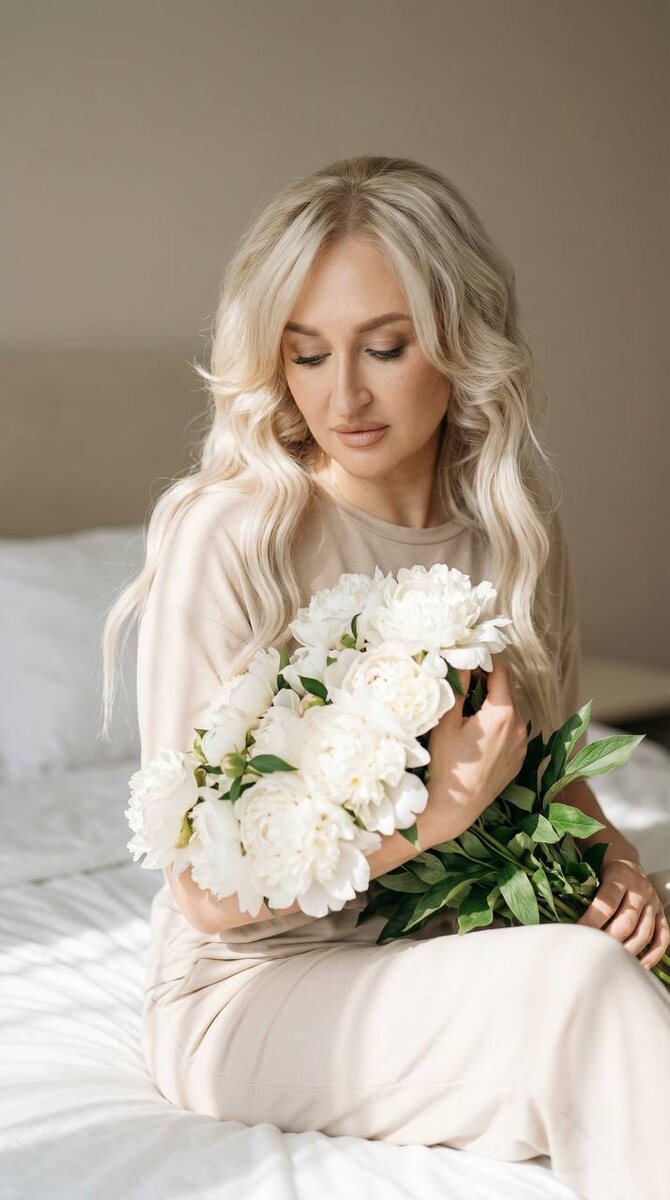 Промты можно загружать в любой агрегатор не меняя черты лица женщины с фото. Фотореалистичный художественный портрет молодой женщины с длинными светлыми волосами, уложенными мягкими волнами. Естественный макияж в натуральных оттенках, аккуратные брови, выразительный взгляд, направленный вниз. Она сидит на светлой кровати с белым постельным бельём. Поза спокойная, расслабленная, передаёт мягкое настроение и внутреннюю сосредоточенность. В руках — большой букет белых пионов с зелёными листьями. Цветы являются центральным элементом композиции. Одежда — светлый минималистичный комплект в нейтральных оттенках. Освещение мягкое, тёплое, естественное, напоминает утренний солнечный свет из окна. Свет создаёт плавные тени и подчёркивает текстуру кожи и лепестков цветов. Фон — светлая однотонная стена без лишних деталей. Небольшая глубина резкости, высокая детализация изображения, мягкая цветовая обработка, чистая композиция кадра, съёмка на портретный объектив с открытой диафрагмой.