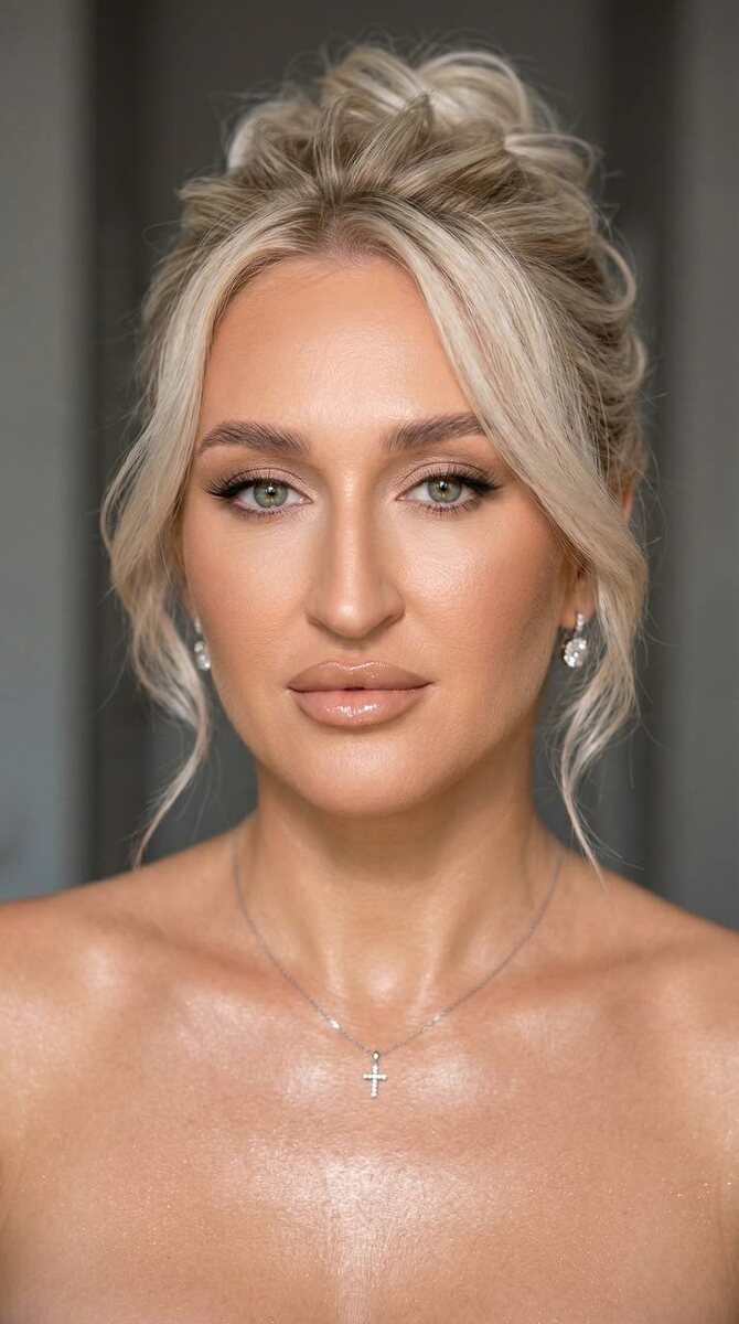 Промты можно загружать в любой агрегатор не меняя черты лица женщины с фото. Фотореалистичный портрет молодой женщины крупным планом. Светлая кожа с ровным тоном и естественным сиянием. Лёгкий скульптурирующий макияж: мягкие бежево-коричневые тени, аккуратные чёрные стрелки, подчёркнутые ресницы, естественные густые брови. Губы объёмные, с блеском телесного оттенка. Волосы светлый блонд, собраны в аккуратную небрежную причёску с мягкими прядями у лица. На ушах небольшие серьги с прозрачными камнями. На шее тонкая серебрянная цепочка с крестом. Открытые плечи и зона декольте с лёгким эффектом естественного сияния кожи. Голова слегка наклонена, взгляд направлен в камеру, выражение спокойное, уверенное, сдержанная эстетика. Мягкое студийное освещение с плавными тенями, высокая детализация кожи, малая глубина резкости, размытый нейтральный фон в серо-холодных тонах. Съёмка на портретный объектив 85 мм, высокая чёткость, реалистичная цветопередача.