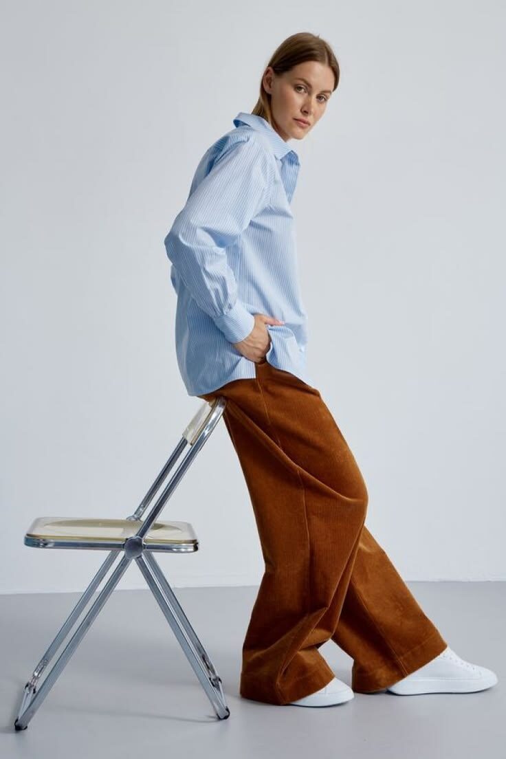 У нее удивительное свойство: она может быть и фоном, и акцентом одновременно. Все зависит от того, с чем ее подружить. И если белая рубашка часто звучит слишком официально, черная - слишком мрачно, то голубая попадает ровно в середину. В ней есть свежесть, но нет стерильности. Есть форма, но нет жесткости.