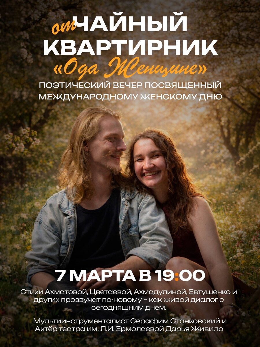 Вечер, посвященный женской сути, с чтением стихов Ахматовой, Цветаевой и других поэтов под аккомпанемент ханга и глюкофона. Участники: мультиинструменталист Серафим Станковский и актриса Дарья Живило. Начало: 07 марта 2026 19:00 Стоимость: От 750.0 руб. до 1000.0 руб. Адрес: г Омск, Ул. Лермонтова, 2 Организатор: https://vk.com/public222749390 🍃Квартирник, посвященный Международному женскому дню «Ода Женщине»🍃 Манифест женской сути. Вечер о её силе и нежности, судьбах и выборе, таинственной притягательности и внутреннем стержне. О многоликости и глубине. Стихи Ахматовой, Цветаевой, Ахмадулиной, Евтушенко и других прозвучат по-новому – как живой диалог с сегодняшним днём. Под аккомпанемент ханга и глюкофона, в сочетании с голосом и тишиной, поэзия станет почти осязаемой. Музыка... #искусство_и_дизайн_поэзия Узнать подробности, адрес или записаться на событие.