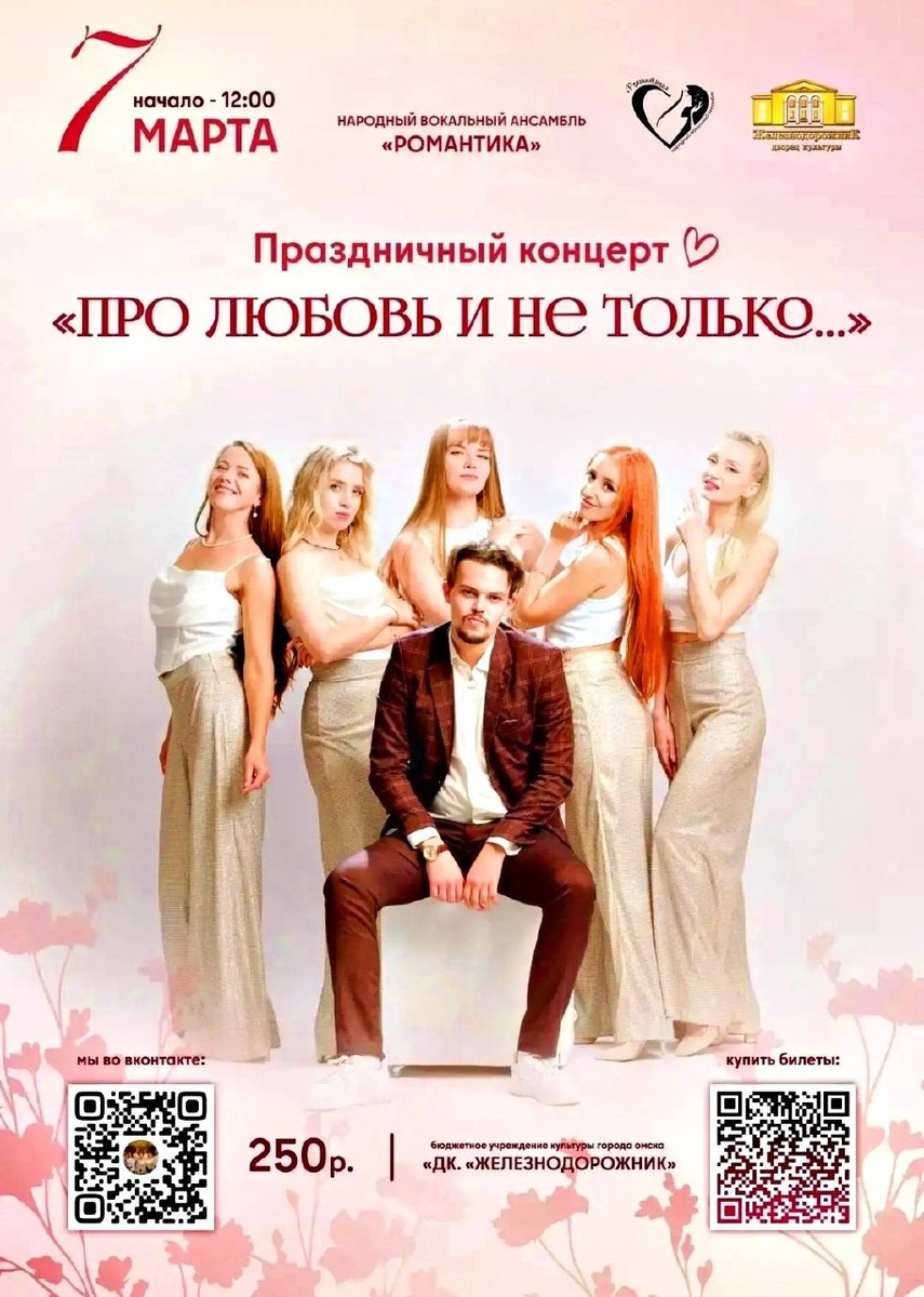 Приглашение на праздничный концерт с исполнением песен и романсов народным вокальным ансамблем «Романтика». Тема мероприятия - любовь и другие чувства. Начало: 07 марта 2026 12:00 Стоимость: 250.0 руб. Адрес: г Омск, 6-я Станционная, 31 Организатор: https://vk.com/public216051626 ЛАО ТОС "Светлый" Приглашение на праздничный концерт «Про любовь и не только….». Комитет ТОС "Светлый" информирует жителей микрорайона о том, что 07.03.2026г. в 12:00 в БУК г. Омска ДК «Железнодорожник» состоится праздничный концерт «Про любовь и не только….». В программе: песни и романсы в исполнении народного вокального ансамбля «Романтика». Стоимость билета 250 рублей. Адрес: ул. 6-я Станционная, д. 31. СПЕШИТЕ ЗА... #развлечения_эстрада Узнать подробности, адрес или записаться на событие.