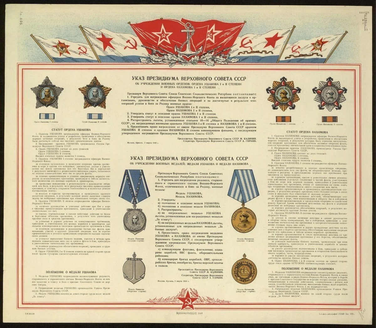 3 марта 1944 года вышел Указ Президиума Верховного Совета СССР об учреждении орденов Ушакова и Нахимова I и II степени и медалей