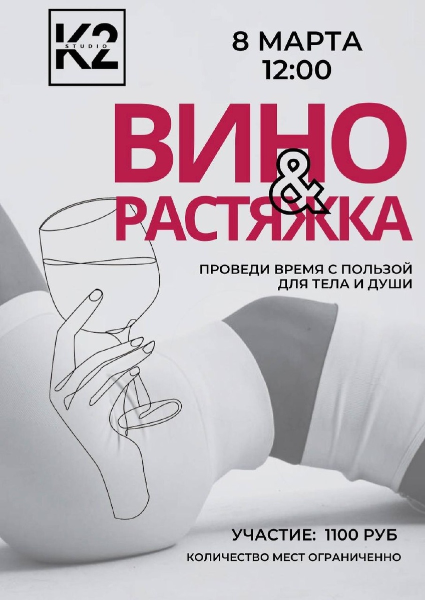 Мероприятие по растяжке с бокалом вина для удовольствия и расслабления. Мягкая разминка, упражнения на гибкость и баланс в комфортной атмосфере. Для непьющих участников будет предложен сок. Начало: 08 марта 2026 12:00 Стоимость: 1100.0 руб. Адрес: г Омск, ул Т.К.Щербанева, д 35 Организатор: https://vk.com/public223545603 ВИНО И РАСТЯЖКА 🍷 Stretching, где важен не результат, а процесс! Бокал вина. Шикарный вид на город. Плавные движения. Никаких рекордов — только удовольствие от того, как тело становится гибче и свободнее. 😌 Что вас ждёт: 1. Мягкая разминка — готовим тело к растяжке. 2. Упражнения на гибкость и баланс — без фанатизма, только комфорт. 3. Бокал вина — для расслабления и удовольствия (1 бокал на занятие - без вреда для... #физкультура_общая_физическая_подготовка Узнать подробности, адрес или записаться на событие.