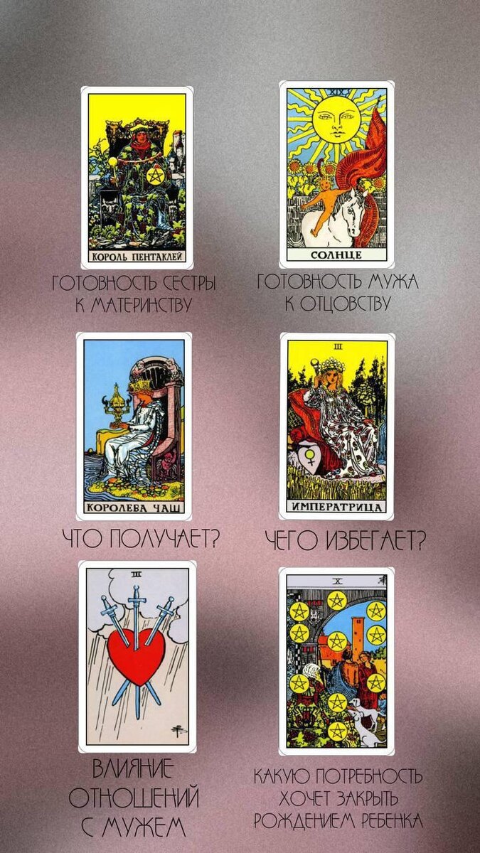Девушка (сестра таролога) с мужем вместе 10 лет, не так давно поженились, до этого то расходились, то расставались. Расставались до свадьбы по причине того, что он не хотел жениться, остепеняться, детей тоже не хотел и не был готов. Но вроде она его дожала, поженились. Оба работают, девушка зарабатывает больше в несколько раз. Он полдня на работе, полдня играет дома в компьютер. Она много работает, стрессует на работе, говорит что хочет уйти в декрет, только чтобы не ходить на работу, но говорит что хочет детей и готова к детям. Забеременеть не получается, сейчас отслеживает овуляцию, ходят на обследования и тд Не понимает, почему не может забеременеть. Пишите в комментариях ваши трактовки.