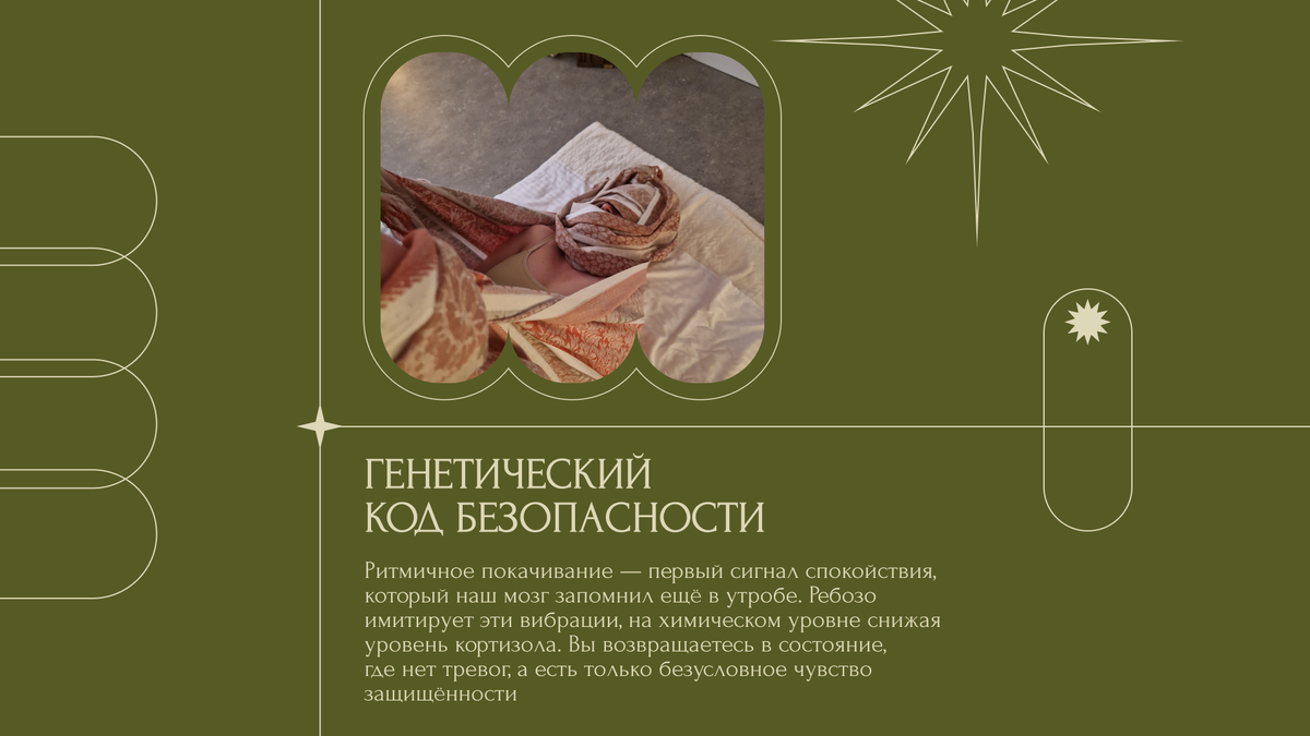 Чувство тотальной безопасности — это дефицит современного города. Мы привыкли жить в «броне», сдерживая эмоции и напряжение. Но наше тело помнит состояние, когда проблем не существовало. Практика Ребозо возвращает в ту самую точку абсолютного покоя через физиологические механизмы, заложенные природой. Нервная система человека формируется в среде постоянного движения и мягкой вибрации. Когда мастер начинает мерно раскачивать полотно, мозг считывает это как сигнал: «Внешних угроз нет». Исследования подтверждают, что такие манипуляции переводят работу мозга из режима активного стресса в альфа-состояние. Это естественный способ затормозить выработку гормонов стресса и дать организму передышку, которую невозможно получить, просто лежа на диване. В периоды сильного напряжения часто возникает чувство «рассыпания», будто почва уходит из-под ног. Плотное обертывание тканью воздействует на глубокие рецепторы давления. В медицине это называется проприоцептивной стимуляцией. Мозг получает четкую и