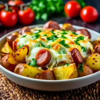 Запечённый картофель с сосисками, помидорами и сыром Это простое и невероятно вкусное блюдо, которое станет отличным обедом или ужином для всей семьи! Нежные ломтики картофеля, сочные сосиски, ароматные помидоры и расплавленный сыр создают аппетитное сочетание. Готовится легко, а результат - пальчики оближешь! Ингредиенты (на 4 порции): Приготовление: Подавайте горячим и наслаждайтесь! Приятного аппетита!