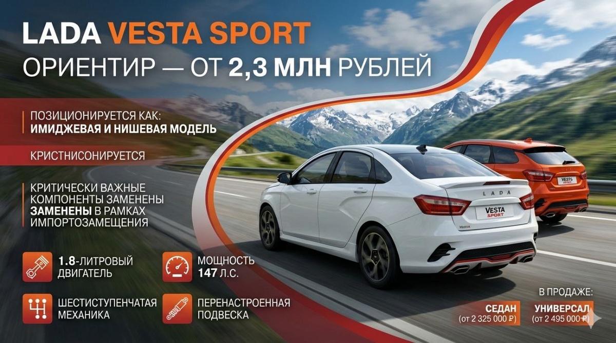 В АвтоВАЗе обозначили ценовой ориентир для новой Lada Vesta Sport: базой служит текущая стоимость Vesta Sportline — от 2 325 000 до 2 355 000 руб. за седан и от 2 495 000 до 2 525 000 руб. за универсал. При этом ожидается доплата за технические доработки — форсированный двигатель и новую трансмиссию. Модель производится в рамках импортозамещения: критически важные компоненты заменены за счёт локальных поставщиков из дружественных России держав. Vesta Sport получит 1,8-литровый двигатель мощностью в 147 л.с., перенастроенную подвеску и шестиступенчатую «механику». В продаже — седан и универсал. Коробка автомат? Можно, а зачем? 🤩 PRO News | Boost Корреспондент Илья Иванов
