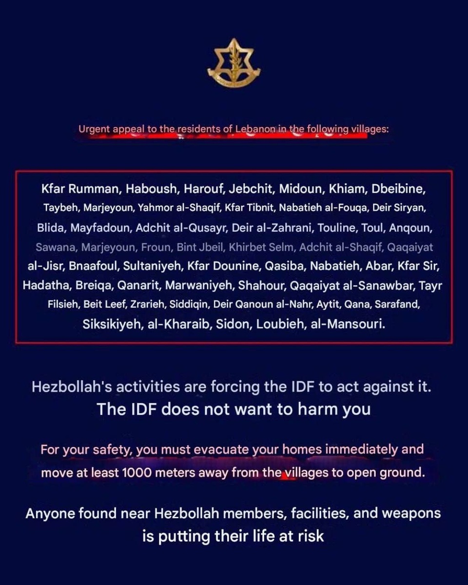 ⚡️ ISRAEL MANDATES EVACUATION IN 50 LEBANESE TOWNS — LIST EXTENDS DEEP INTO SOUTHERN REGIONS