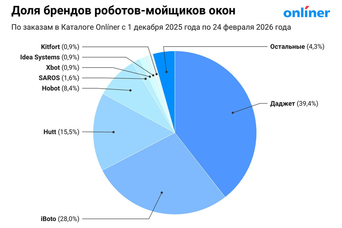 Согласно статистике заказов в Каталоге Onlíner в сегменте роботов — мойщиков окон, на протяжении долгого времени бесспорным лидером является бренд «Даджет», который на сегодня забирает почти 40% рынка. Вслед за ним идут еще 3 заметных игрока: iBoto (28%), Hutt (15,5%) и Hobot (8,4%). Статистика по отдельным моделям лишь подтверждает эти цифры — список «топ-10 самых продаваемых роботов-мойщиков» состоит исключительно из этих брендов.