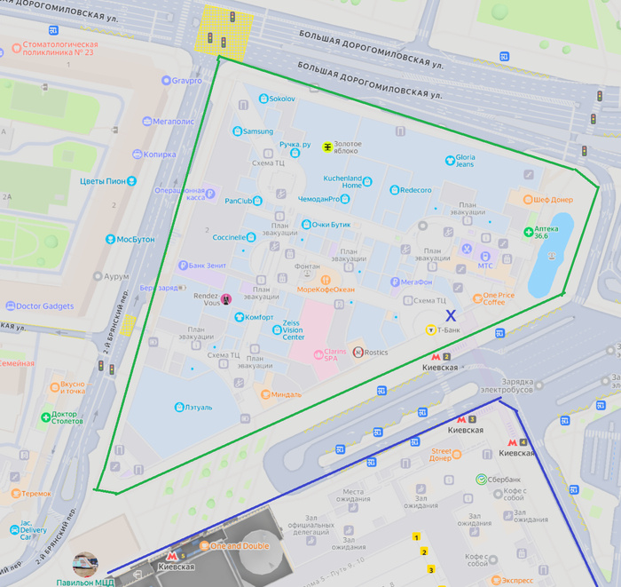 РЖУ НИМАГУ!! Вот шо бывает, когда не проверяешь после ИИ, зато понты колотишь: Для немосквичей поясняю с картинкой. ЗЕЛЕНЫМ я обвел ТЦ Европейский, о котором идет речь в посте ТС. ФИОЛЭТОВЫМ ТЁМНО-СИНИМ я обвел здание Киевского вокзала и соответсвенно входов в метро Киевская. Но мало того... Две БОЛЬШАЯ буква ХЭ фиолетового тёмно-синего цвета -это прямой выход ИЗ ТЦ ПРЯМО НЕПОСРЕДСТВЕННО В МЕТРО. [Спасибо @Psychonomic за справедливое уточнение] Уважаемые @moderator, Тег "ИИ" или что там полагается, воткните пожалуйста. P.S. Лет 20 назад я бы еще поверил в эту "скаску". Сейчас там каждые 5 метров (условно говоря) - патрули (и кстати военная комендатура там патрулировала всегда тоже.). Это один из самых проверяемых и охраняемых (по понятным причинам) вокзалов Москвы. PPS Я кстати вспомнил - непосредственно на площади заперещена вообще даже остановка, не то что парковка. Там конечные остановки у штук 30 маршрутов. Со стороны Большой Дорогомиловской, условно говоря сверху, парковка запреще