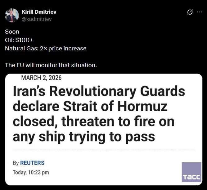 Специальный представитель президента РФ Кирилл Дмитриев прокомментировал закрытие Ормузского пролива тем, что скоро будет огромный рост стоимости нефти. По его мнению так рынок реагирует на эскалацию. Ранее сообщалось, что нефть может подняться в цене до $200 из-за перекрытия Ормузского пролива. Подпишись на БородинLIVE Новости
