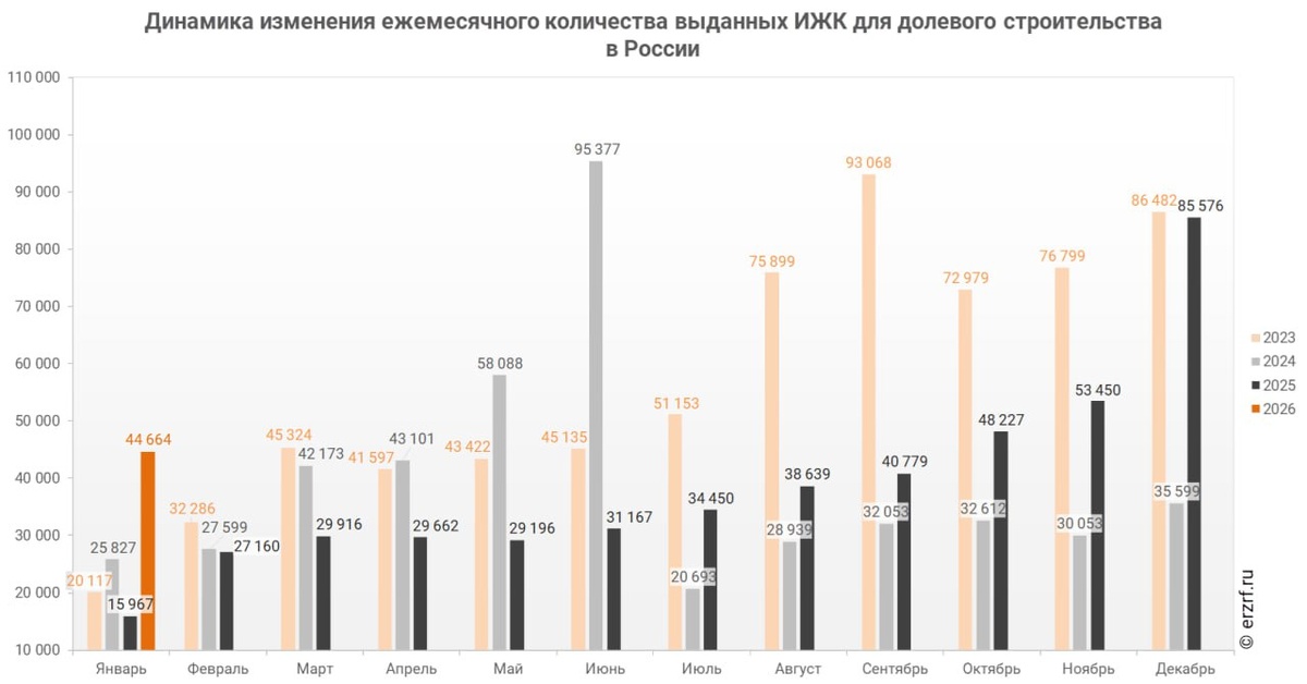 🦅 По данным Банк России, за январь 2026 года в стране выдано 44 664 ипотечных кредита на долевое строительство накопленным итогом. Год назад показатель составлял 15 967 кредитов.