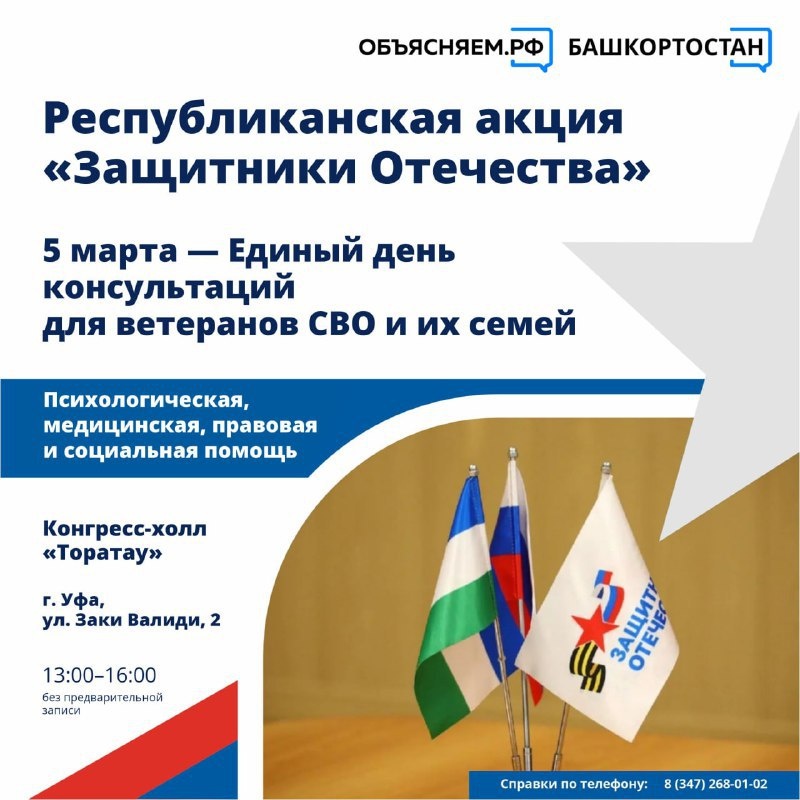 Организатором выступает филиал фонда «Защитники Отечества» в Башкортостане. В рамках мероприятия подопечные фонда смогут получить психологическую, медицинскую, социальную и правовую помощь. Место встречи: Конгресс-холл «Торатау» (г. Уфа, ул. З. Валиди, 2). Время — с 13:00 до 16:00 (без предварительной записи). Вход: свободный. Обратите внимание. В это же время в 15:00 в Конгресс-холле состоится торжественный концерт, посвященный Международному женскому дню. На концерт приглашены женщины региона. Особое внимание — матерям, женам и вдовам наших героев, женщинам-общественникам, лидерам и руководителям. #ОбъясняемРФ #ОбъясняемБашкортостан #Аңлатабыҙ_Башҡортостан
