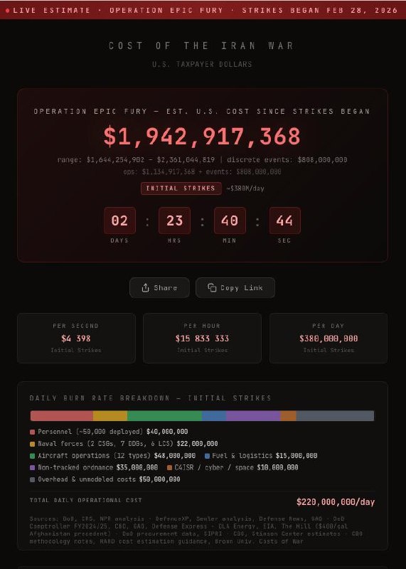 Войну против Ирана поставили на счетчик. В сети появился сайт, подсчитывающий в реальном времени расходы США на военные действия в Персидском заливе. Каждую секунду из американского бюджета на войну с персами уходит 4,4 тыс. долларов. На момент публикации Пентагон потратил на бомбардировки $1,9 млрд. Подпишись на БородинLIVE Новости