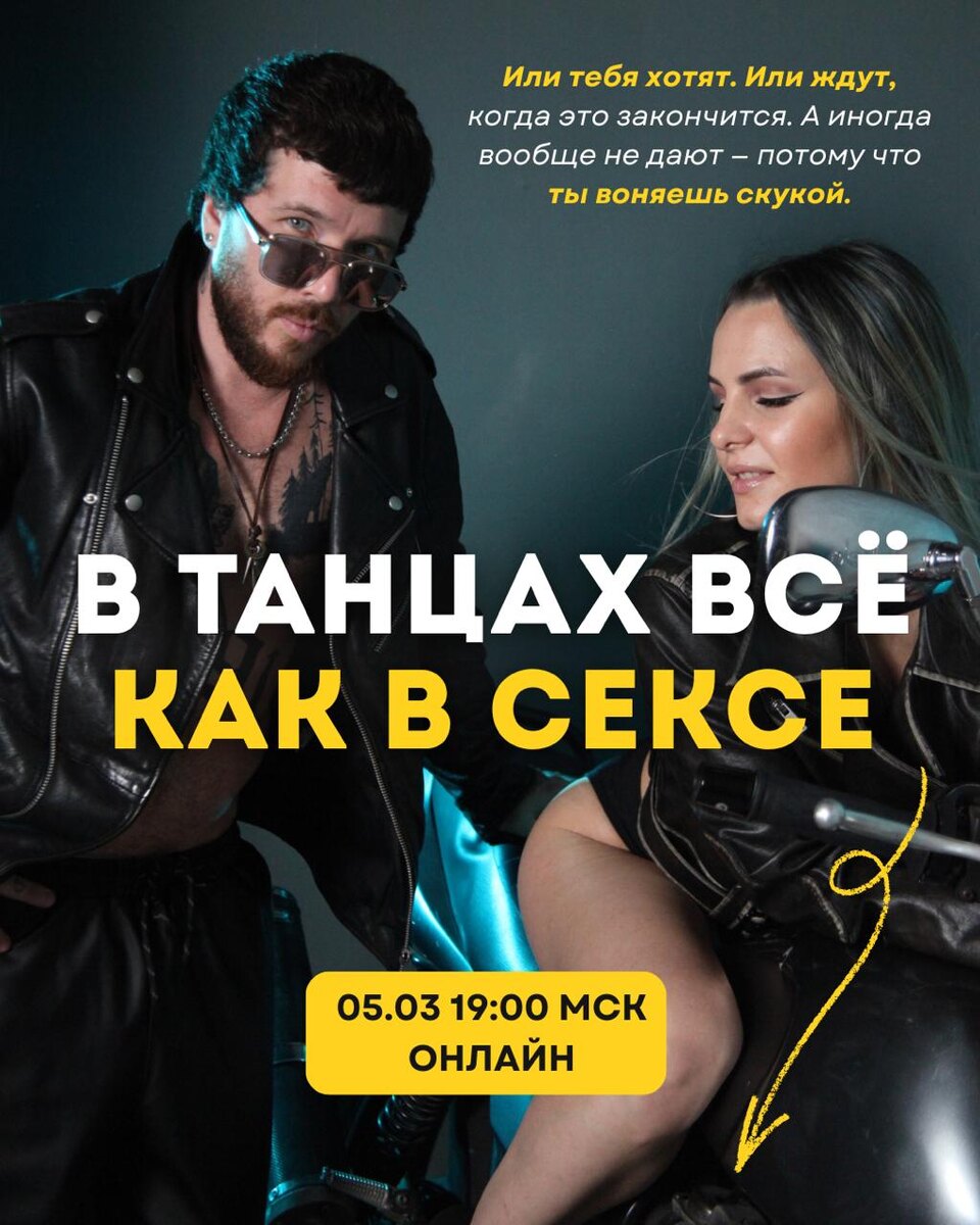 🔞 Или тебя хотят. Или ждут, когда это закончится. А иногда вообще не дают — потому что ты воняешь скукой. Жёстко? Да. Но если вы давно танцуете Бачату — вы точно это чувствовали: Когда с вами танцуют «ну ладно». Когда движения правильные, а интереса — ноль. Когда вы стараетесь, а партнёр уже мысленно не с вами. Это не про технику. И не про талант. Это про отсутствие языка. Скука в танце появляется не потому, что мало движений, а потому что вы говорите одно и то же… Без пауз. Без контраста. Без акцентов. Без игры. Танец без языка — это слова без интонации. Слушать можно. Хотеть — нет. 📅 5 марта | 19:00 мск | Онлайн-интенсив «В танце всё как в сексе» Важно: — Записи не будет — Повтора не будет — Подарок получат только те, кто будет онлайн Если хотите, чтобы с вами хотели танцевать, а не терпели – регистрируйтесь и приходите. 👉🏻 Регистрация по ссылке: https://t.me/bazil_dance_robot?start=veb_05_03r