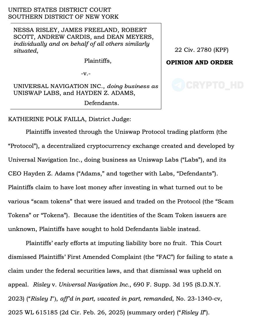 Федеральный суд в Нью-Йорке отклонил коллективный иск против Uniswap Labs и его основателя. Истцы пытались доказать, что платформа якобы помогала мошенникам проводить схемы «rug pull» и «pump and dump». Главное из решения: • Uniswap НЕ отвечает за действия сторонних эмитентов токенов. • Сам факт существования платформы НЕ означает содействие мошенничеству. • Разработчики открытого кода НЕ несут ответственность за то, как его используют злоумышленники. Иск рассматривался почти четыре года и был окончательно отклонен без права повторной подачи. ❓Почему это важно: Суд фактически подтвердил принцип — протокол ≠ действия пользователей. Ранее: - протокольные комиссии - патентный спор - BlackRock и Securitize Crypto Headlines