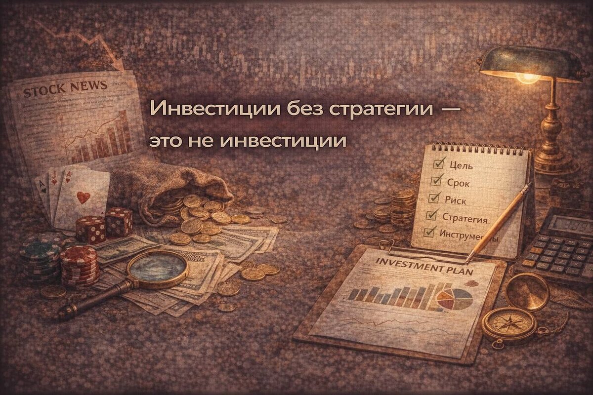 Многие называют инвестициями любой факт покупки актива. Но покупка без понимания — это не стратегия. Это набор случайных идей. ⸻ 🧠 Чем стратегия отличается от идей Идея — это мысль: «кажется, это вырастет». Стратегия — это система: — зачем я покупаю — на какой срок — что делаю при росте — что делаю при падении 📌 Идеи живут эмоциями. Стратегия — правилами. ⸻ 🎯 Почему «куплю и посмотрю» не работает Фраза «посмотрю, как пойдёт» означает одно: решения будут на эмоциях. Когда рынок растёт — появляется жадность. Когда падает — страх. Без заранее принятых решений ты всегда реагируешь, а не управляешь. ⸻ 🧩 Что должно быть в минимальной стратегии Минимум, без лишней сложности: — цель инвестирования — срок — допустимая просадка — правило докупок — правило выхода Это не Excel. Это несколько честных ответов для себя. ⸻ 📊 Пример простой логики Например: — цель: долгосрочный рост капитала — срок: 10+ лет — стратегия: регулярные покупки — падение: не продаю, могу докупить — р