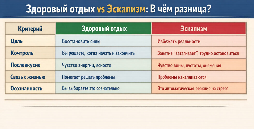 Как распознать, чем здоровый отдых отличается от бегства от проблем, и как вернуться в свою жизнь.