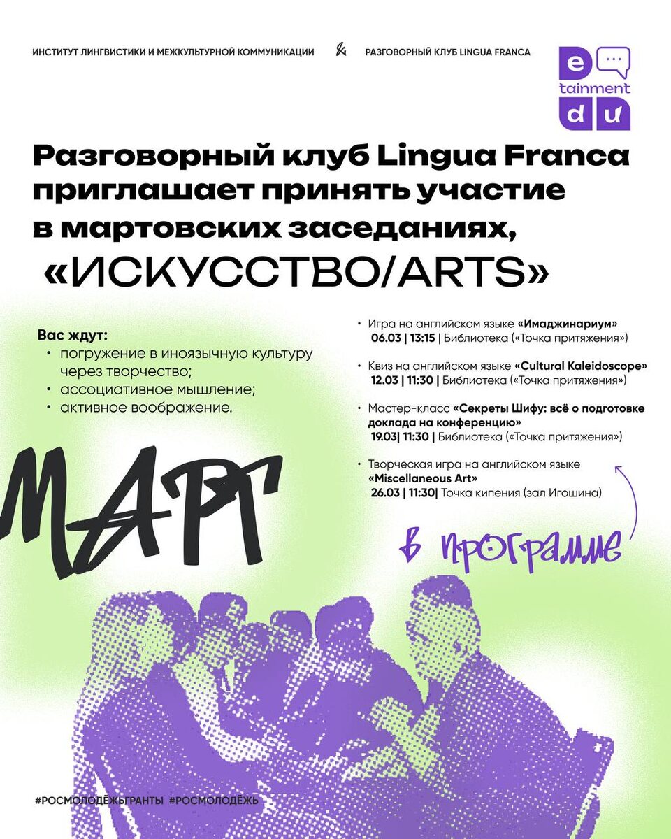 ! Институт лингвистики и межкультурной коммуникации и разговорный клуб «Lingua Franca» вместе со студентами школы «Edutainment» приглашают вас на серию мартовских встреч на тему «Искусство / Arts». Погружаемся в культуру через творчество, ассоциации и живое воображение — и всё это в увлекательном формате на английском и русском языках! 📅 РАСПИСАНИЕ МЕРОПРИЯТИЙ: 🎲 Игра на английском «Имаджинариум» 🗓 6 марта | 13:15 📍 Библиотека («Точка притяжения») 🔗 Подробнее и регистрация 🧩 Квиз на английском «Cultural Kaleidoscope» 🗓 12 марта | 11:30 📍 Библиотека («Точка притяжения») 🔗 Подробнее и регистрация 🎤 Мастер-класс «Секреты Шифу: всё о подготовке доклада на конференцию» 🗓 19 марта | 11:30 📍 Библиотека («Точка притяжения») 🔗 Подробнее и регистрация 🎨 Творческая игра на английском «Miscellaneous Art» 🗓 26 марта | 11:30 📍 Точка кипения (зал Игошина) 🔗 Подробнее и регистрация Мероприятия проходят в рамках программы «Новый проект: Школа спикеров-организаторо