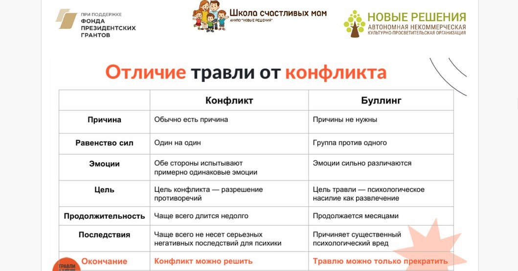 ? 💥Что такое травля (буллинг)? Это не обычный конфликт между детьми. Его отличительные черты: - агрессивное/негативное поведение; - регулярность; - умышленность; - неравенство сил. 🫥Жертвой буллинга может стать любой ребенок. Данные опросов показывают, что каждый второй ребенок сталкивается с травлей. 🆘Буллинг разрушает все сферы жизни ребенка, влияя не только на отношения, но и на мышление, самоидентичность, физическое здоровье. У буллинга есть и долгосрочные последствия, порой он коверкает всю последующую жизнь человека, приводя к проблемам в семье и на работе. ❗️Два главных принципа борьбы со школьным буллингом: обеспечение безопасности ребенка и придание ситуации гласности. Самое опасное для ребёнка – остаться с ситуацией буллинга наедине. ➡️Важно! В буллинг всегда включены все участники группы – агрессор, жертва, свидетели. Все они нуждаются в помощи. На вебинаре узнали, как поддержать ребенка-жертву и как действовать, если ребенок – агрессор или наблюдатель. 📌На занятии