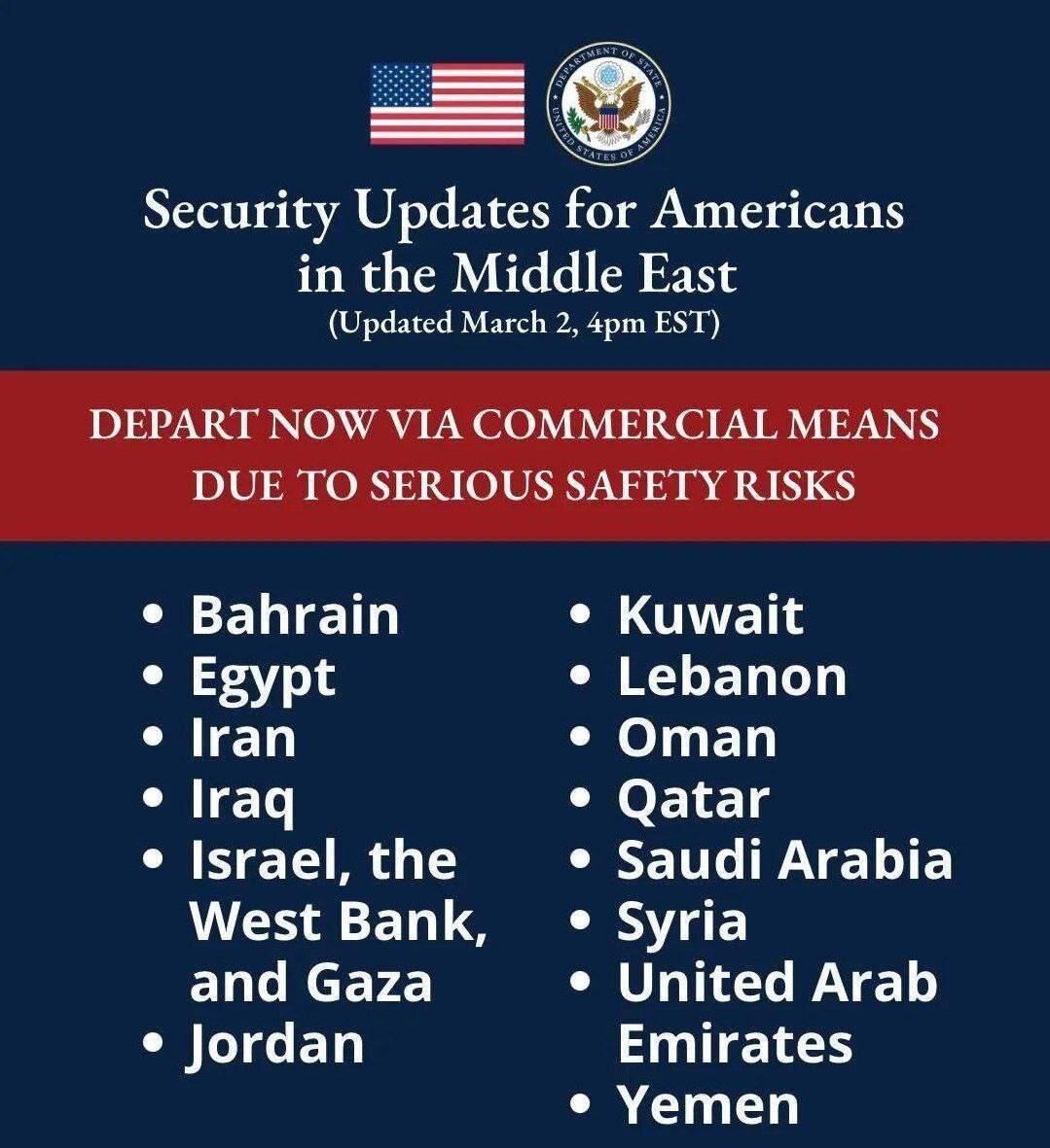 Пока вы спали, Госдеп США призвал своих граждан немедленно покинуть Ближний Восток