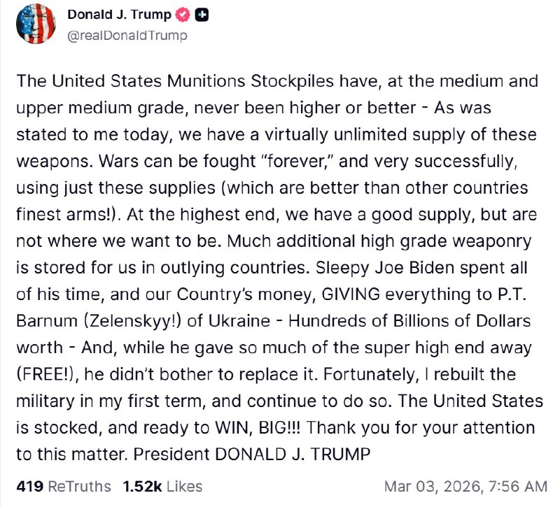 Как мне сегодня доложили, у нас есть практически неограниченный запас этих вооружений. Войны можно вести «вечно» и весьма успешно, используя только эти запасы (которые превосходят лучшие вооружения других стран!). На самом высоком уровне у нас есть хороший запас, но это не тот показатель, к которому мы стремимся. Много дополнительного высококлассного оружия хранится для нас в отдаленных странах. Сонный Джо Байден потратил все свое время и деньги нашей страны, ОТДАВАЯ всё П.Т. Барнуму (Зеленскому!) из Украины — на сотни миллиардов долларов — И, в то время как он раздал так много сверхвысококлассного оружия (БЕСПЛАТНО!), он не удосужился восполнить его. К счастью, я восстановил вооруженные силы в свой первый срок и продолжаю это делать. Соединенные Штаты укомплектованы запасами и готовы ПОБЕЖДАТЬ ПО-КРУПНОМУ!!! Спасибо за ваше внимание к этому вопросу. 👆Дональд (тонкий) Трамп. * Финеас Тейлор Барнум (англ. Phineas Taylor Barnum) — американский шоумен, антрепренёр, крупнейшая фигура ам