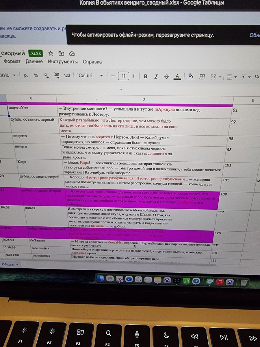 Этот файл издательство присылает после того, как отслушает вашу аудиокнигу. И я каждый раз восхищаюсь человеческой усидчивости, труд редактора за гранью моего понимания. Человек отслушивает книгу, параллельно прослеживая глазами текст, замечает все неточности и фиксирует в таблицу. А слушатели потом наслаждаются правильными ударениями и чистой речью. Меня же потрясывает от одной мысли, что что-то нужно заносить в таблицу☺️