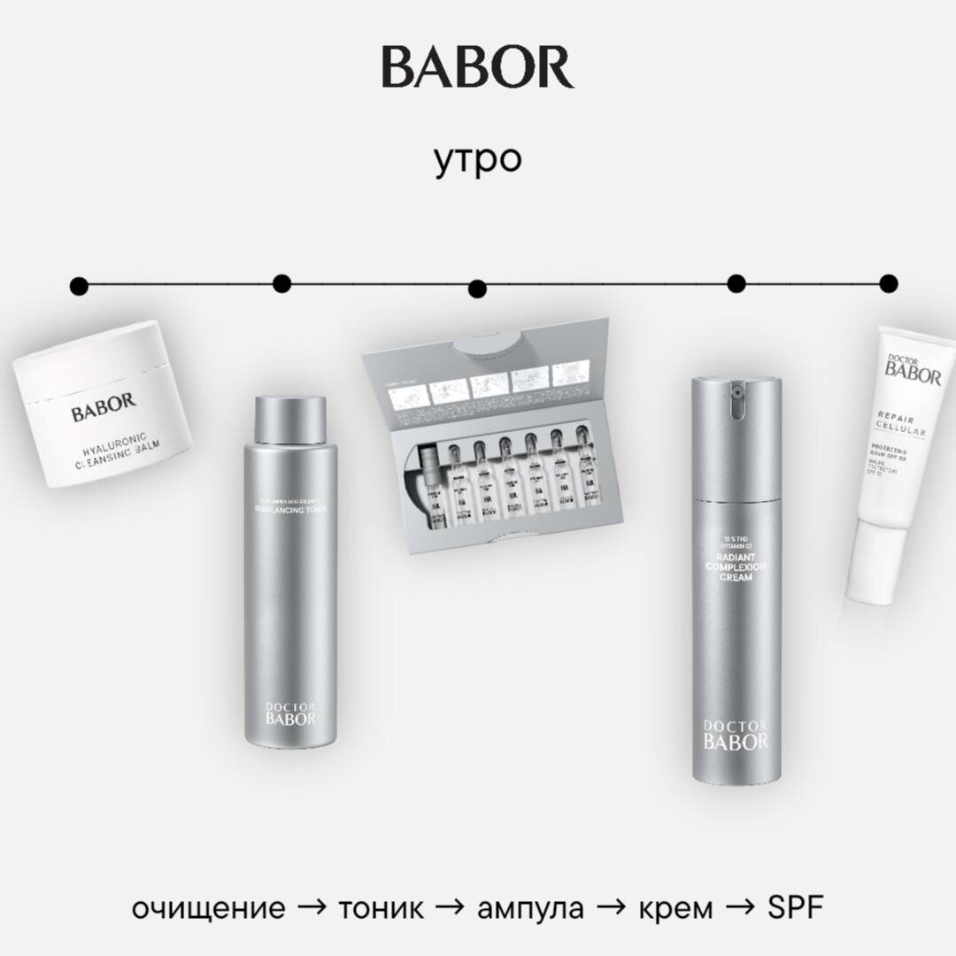 #BABOR_подбор_ухода Весной и летом добавляется ещё одна задача — сохранить сияние и не усилить пигментацию. Мы собрали систему, которая поддерживает кожу в тёплый сезон и помогает выглядеть свежо и ухоженно. Предлагаем сохранить эту схему — это готовый чек-лист профессионального ухода BABOR. — Очищающий бальзам — Регенерирующий тоник — Увлажняющие ампулы с мультигиалуроновой кислотой (утром) — Сыворотка для сияния кожи (вечером) — Выравнивающий крем — SPF 30–50 или DOCTOR BABOR PRO (утром обязательно) — Антиоксидантный пилинг-гель с AHA-кислотами (1 раз в неделю) Ежедневный SPF — ключевой шаг в уходе 50+. Без защиты от ультрафиолета пигментация усиливается, а коллаген разрушается быстрее. Даже самый эффективный крем не даст устойчивого результата без солнцезащиты. Есть ли чувствительность или реакция на кислоты у вас? Подберём интенсивность ухода индивидуально. #BABOR ВК | РИТМ | ДЗЕН | ПРИЛОЖЕНИЕ