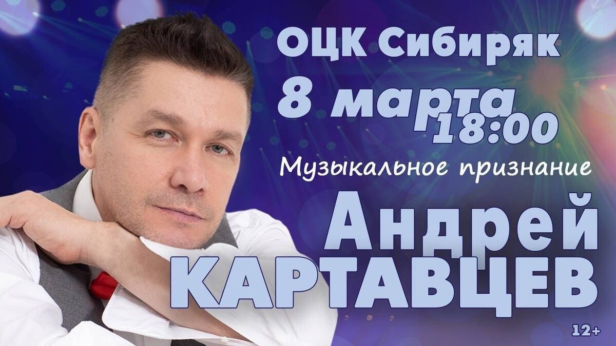 Концерт Андрея Картавцева, посвящённый прекрасным дамам. В программе прозвучат популярные и новые композиции о любви, создающие атмосферу тепла и романтики. Начало: 08 марта 2026 18:00 Стоимость: От 300.0 руб. до 1000.0 руб. Адрес: г Омск, ул Красный Путь, д 68 Организатор: https://vk.com/public115943919 Утро в Культурной столице! #Сибиряк_приглашает 💐8 марта в 18.00 в Областном центре культуры «Сибиряк» состоится концерт «Музыкальное признание» с Андреем Картавцевым. 🌹Приглашаем вас отметить самый нежный, весенний и вдохновляющий праздник — Международный женский день 8 марта! 🌸В этот особенный вечер, Андрей Картавцев, посвящает все свои песни вам, прекрасные дамы. 🌺Это не просто концерт, а искреннее, музыкальное послание, сотканное из самых красивых историй о любви,... #развлечения_эстрада Узнать подробности, адрес или записаться на событие.