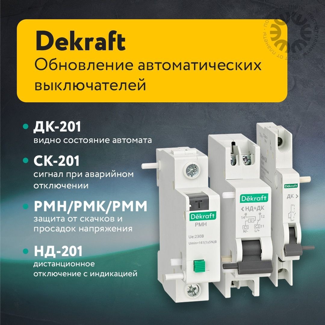 Systeme Electric ΡΠ°ΡΡΠΈΡΠΈΠ»Π° ΡΡΠ½ΠΊΡΠΈΠΎΠ½Π°Π» Π°Π²ΡΠΎΠΌΠ°ΡΠΎΠ² ΠΠ-201 DEKraft Π½ΠΎΠ²ΡΠΌ Π½Π°Π±ΠΎΡΠΎΠΌ Π°ΠΊΡΠ΅ΡΡΡΠ°ΡΠΎΠ². ΠΠ΅Π· ΡΡΠΌΠ° β Π½ΠΎ Ρ ΠΏΠΎΠ»ΡΠ·ΠΎΠΉ: π’ ΠΠ-201 β Π²ΠΈΠ΄Π½ΠΎ ΡΠΎΡΡΠΎΡΠ½ΠΈΠ΅ Π°Π²ΡΠΎΠΌΠ°ΡΠ° (Π²ΠΊΠ»/Π²ΡΠΊΠ») ΡΠ΄Π°Π»ΡΠ½Π½ΠΎ π’ Π‘Π-201 β ΡΠΈΠ³Π½Π°Π» ΠΏΡΠΈ Π°Π²Π°ΡΠΈΠΉΠ½ΠΎΠΌ ΠΎΡΠΊΠ»ΡΡΠ΅Π½ΠΈΠΈ π’ Π ΠΠ/Π ΠΠ/Π ΠΠ β Π·Π°ΡΠΈΡΠ° ΠΎΡ ΡΠΊΠ°ΡΠΊΠΎΠ² ΠΈ ΠΏΡΠΎΡΠ°Π΄ΠΎΠΊ Π½Π°ΠΏΡΡΠΆΠ΅Π½ΠΈΡ π’ ΠΠ-201 β Π΄ΠΈΡΡΠ°Π½ΡΠΈΠΎΠ½Π½ΠΎΠ΅ ΠΎΡΠΊΠ»ΡΡΠ΅Π½ΠΈΠ΅ Ρ ΠΈΠ½Π΄ΠΈΠΊΠ°ΡΠΈΠ΅ΠΉ ΠΡΠ΅ΠΏΠ»Π΅Π½ΠΈΠ΅ Π½Π° ΡΡΠΈΡΡΠ°Ρ