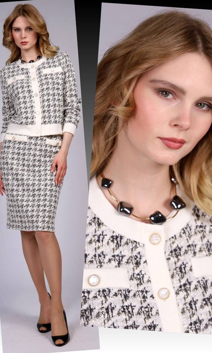 👌🏻Наша маленькая кампания в стиле Шанель в сборе. Поговорим о деталях. ⏺️Фишка, конечно же, в самой ткани. Мягкий, чуть рыхлый буклированный трикотаж позволил уйти от жесткой формы жакета, сохранив при этом четкую форму классики. ⏺️Жакет без подкладки, но со всей атрибутикой Шанель- канты, клапаны и эффектная фурнитура. ⏺️При этом в новом варианте он потрясающе легкий и комфортный. ⏺️Юбка на подкладке с такими же белыми клапанами и с резинкой по линии талии. ⏺️Бело черная гамма с добавлением золотой нитки , броская бижутерия делают костюм по настоящему нарядным. ⏺️Да и размеры радуют до 58! Альтернатива жакету- изящный белый или черный кардиганы с фирменными пуговицами и объёмным рукавом до локтя. ⏺️Ну и конечно же, платье баллон для неформалок!