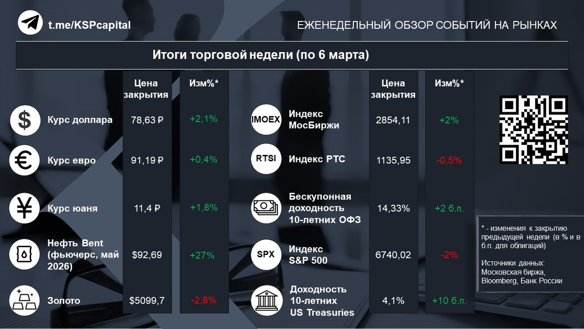 🇷🇺 Рынок акций РФ в первую неделю марта подрос на ожиданиях новостей о следующем раунде трехсторонних переговоров по урегулированию украинского конфликта, а также благодаря скачку цен на нефть из-за эскалации напряженности на Ближнем Востоке. Индексы начали неделю с роста вслед за раллировавшими мировыми ценами на нефть и драгметаллы после ударов США и Израиля по Ирану, а также благодаря данным Росстата о замедлении инфляции. По итогам торгов понедельника индекс «МосБиржи» составил 2835,65 пункта (+1,3%), индекс РТС – 1157,51 пункта (+1,4%). Лидировали в росте акции «Татнефти» (+10,3%), «Роснефти» (+8,8%), «Лукойла» (+5,8%), «Новатэка» (+5,3%), «Сургутнефтегаза» (+3,4% и +3% «префы»). Совет директоров «Новатэка» рекомендовал финальные дивиденды за 2025 г. в размере 47,23 руб. на акцию, тогда как консенсус составлял 42,9 руб. на бумагу (закрытие реестра акционеров под выплаты – 13 апреля). Согласно вышедшим вечером 27 февраля данным Росстата, инфляция в РФ с 17 по 24 февраля составила 0,19% (из-за праздника расчет за 8 дней) после 0,12% с 10 по 16 февраля. Из данных за 24 дня февраля этого и прошлого годов следует, что годовая инфляция в РФ на 24 февраля замедлилась до 5,8% с 5,87% на 16 февраля.