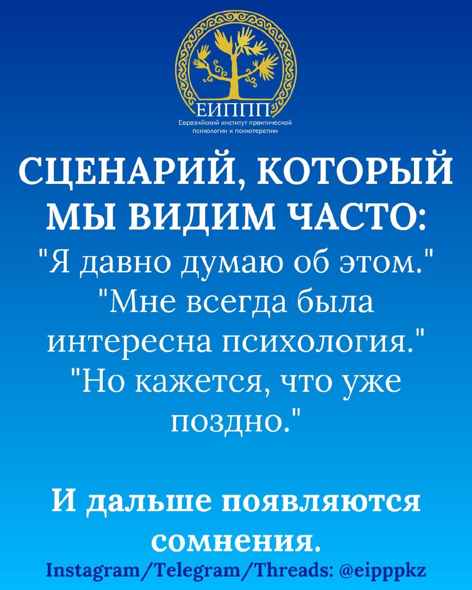 После нашего поста про мифы о профессии психолога в комментариях и личных сообщениях всплыло много похожих историй. Сценарий почти всегда одинаковый: 🔹Человек давно интересуется психологией. 🔹Читает книги. 🔹Смотрит лекции. 🔹Помогает друзьям разбираться в их проблемах. И где-то внутри уже давно сидит мысль: "Мне кажется, я мог бы этим заниматься." Но дальше появляется голос сомнения. Иногда это внутренний голос. Иногда чей-то внешний. 🔹"Поздно уже менять профессию." 🔹"Сейчас психологов как грязи." 🔹"Это вообще не профессия." 🔹"На этом не заработаешь." И человек откладывает идею ещё на год. Потом ещё на два. Иногда на десять. И знаете, что интересно? Те же самые люди потом говорят: "Жаль, что я не начал раньше." Психология — это не та сфера, где всё решает только диплом. Это сфера, где решает подготовка и практика. Можно десять лет читать книги и так и не начать работать с людьми. А можно выстроить системную подготовку и через время спокойно вести консультации. И именно п