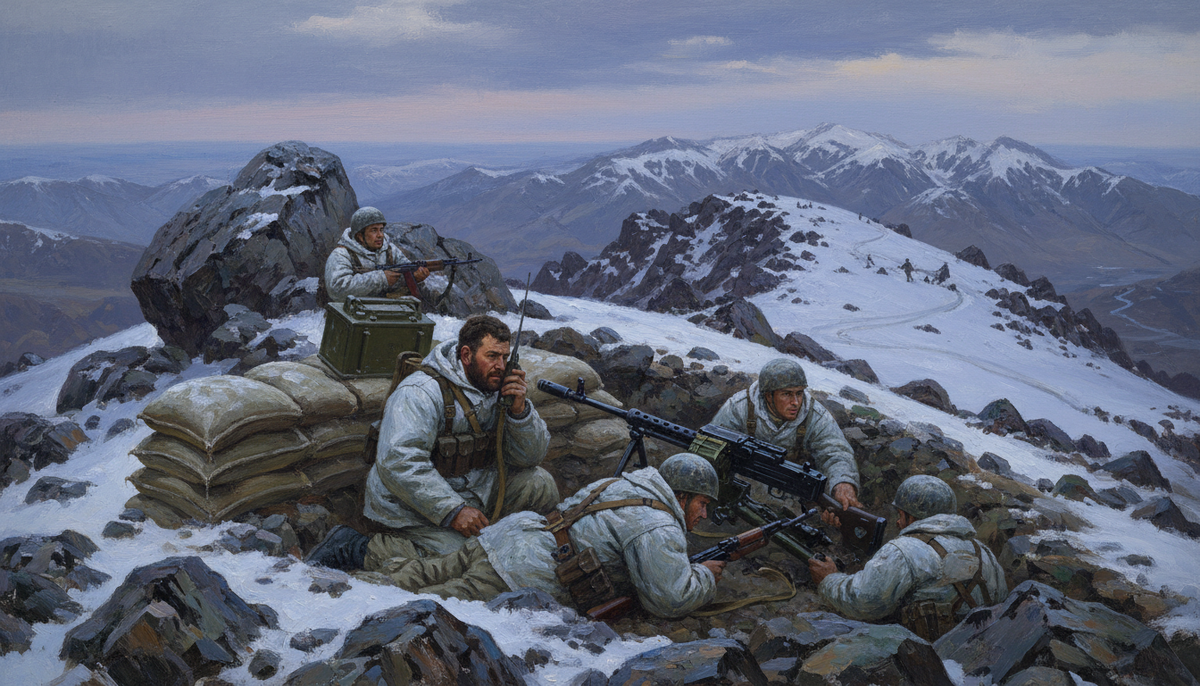 Первое, что сделали десантники после захвата высоты, — начали копать. Мёрзлый камень, обледеневшая земля, минус двадцать. Никаких разговоров у костра. Окопы, ходы сообщения, укрытия, минное поле с южной стороны — наиболее вероятного направления атаки. Расчёт крупнокалиберного пулемёта «Утёс» занял позицию.